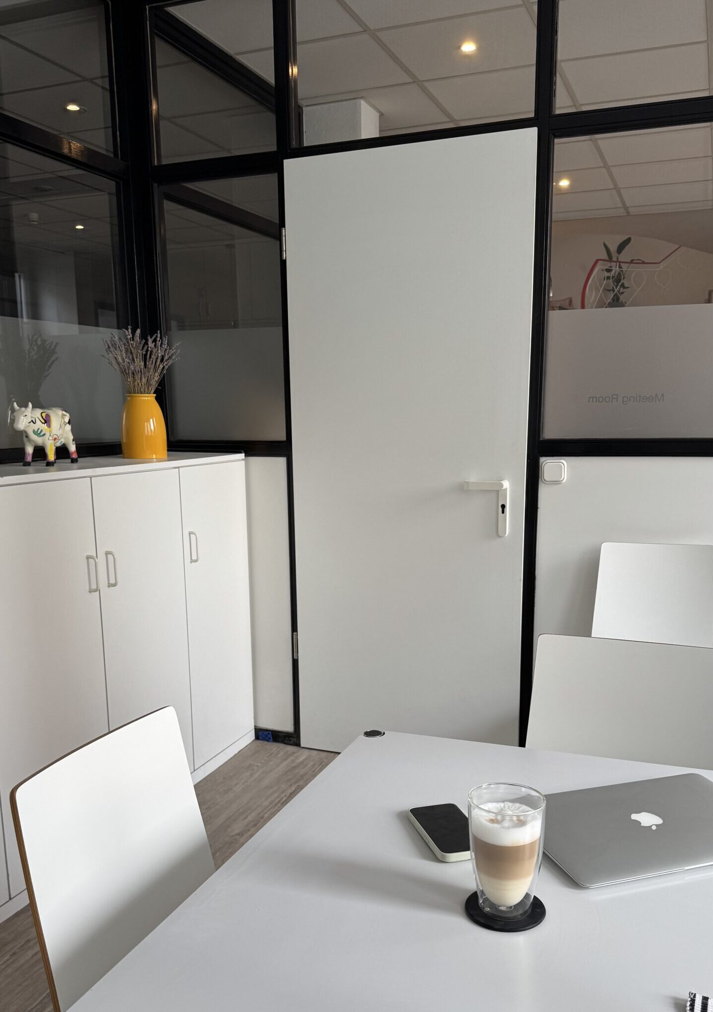 Der lichtdurchflutete Meeting Room S bietet Platz für bis zu 8 Personen. Teppichboden und Sichtschutz schaffen eine angenehme Atmosphäre.